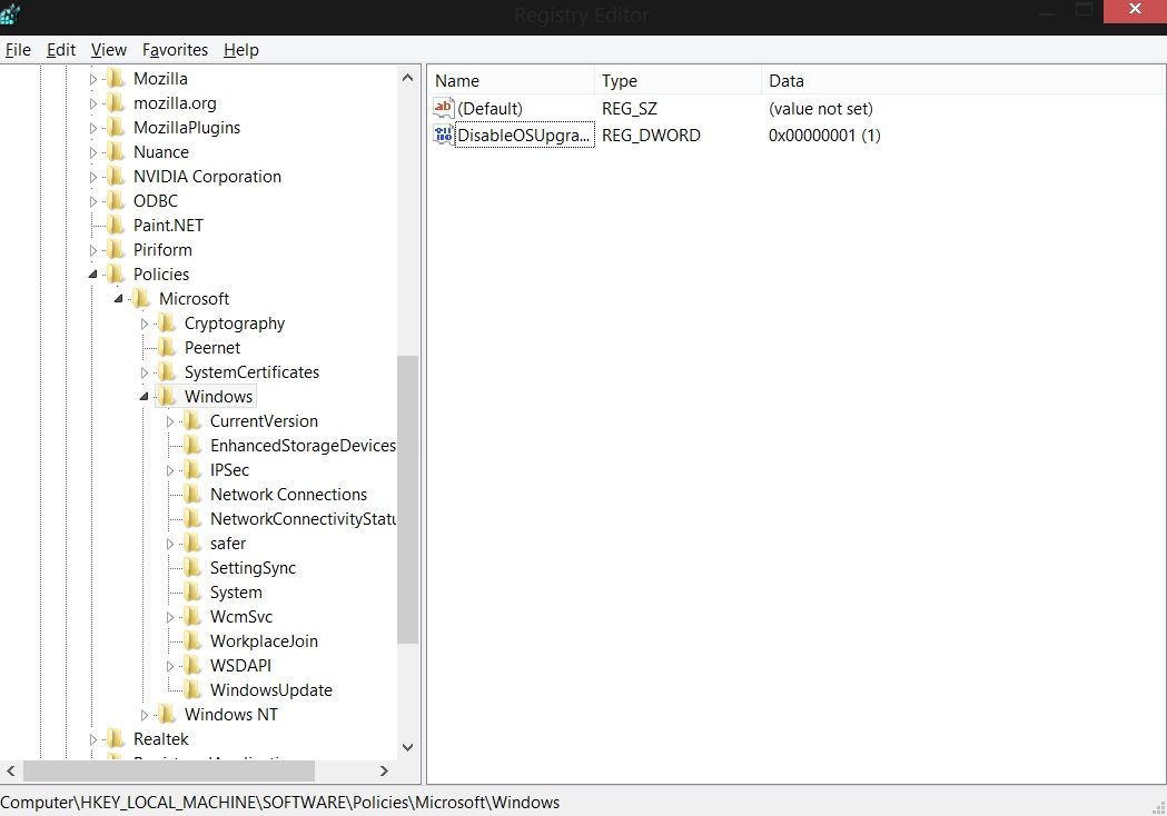 Now locate HKEY_LOCAL_MACHINE\SOFTWARE\Policies\Microsoft\Windows and right-click Windows. Now choose New, then Key, and type WindowsUpdate. Now click on this new key and under this make a 32-bit DWORD calledDisableOSUpgarde with a value of 1.